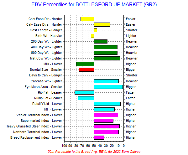 Up Market is a outcross bull for us from the outstanding Bottlesford herd. This fellow is chock full of meat, a long deep bull with fantastic conformation. He scanned the heaviest in his drop also with the biggest EMA and highest IMF.